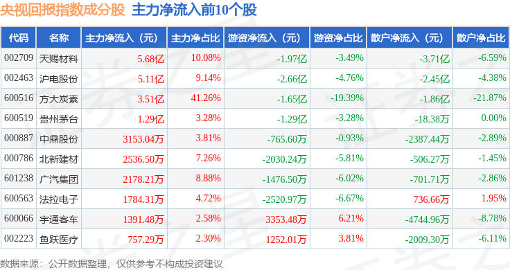 资金流向方面,央视回报(399553)指数成份股当日主力资金净流出合计3.48亿元,游资资金净流出合计3543.5万元,散户资金净流入合计3.83亿元。成份股资金流向详情见下表: