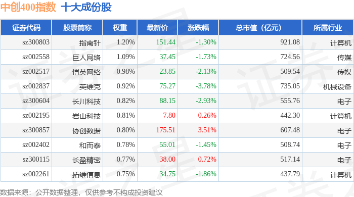 证券之星消息,10月28日,中创400(399624)指数报收于2497.82点,跌0.26%,成交2755.39亿元,换手率2.79%。当日该指数成份股中,上涨的有149家,联特科技以15.12%的涨幅领涨,下跌的有243家,中顺洁柔以8.74%的跌幅领跌。