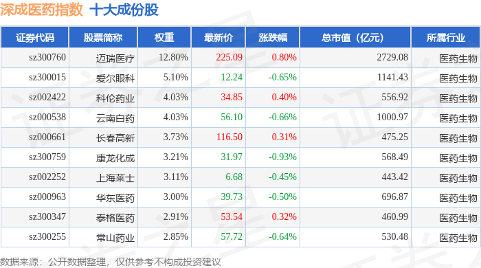 证券之星消息,10月28日,深成医药(399685)指数报收于1741.07点,跌0.22%,成交217.04亿元,换手率1.33%。当日该指数成份股中,上涨的有24家,我武生物以6.71%的涨幅领涨,下跌的有31家,英科医疗以8.58%的跌幅领跌。