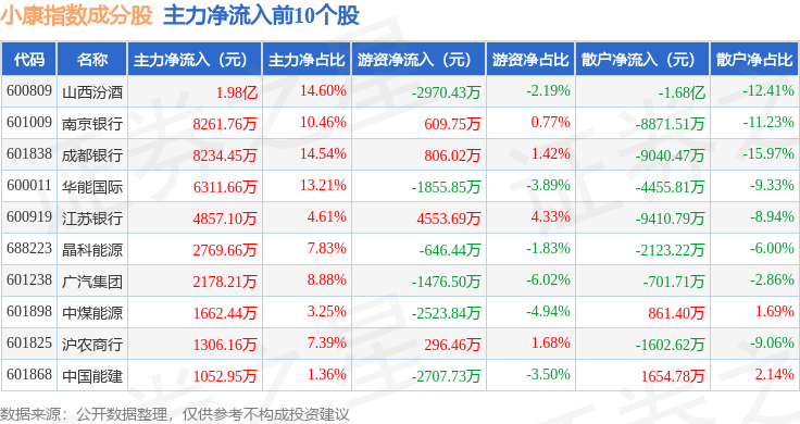 资金流向方面,小康指数(399901)成份股当日主力资金净流出合计87.66亿元,游资资金净流入合计31.7亿元,散户资金净流入合计55.96亿元。成份股资金流向详情见下表: