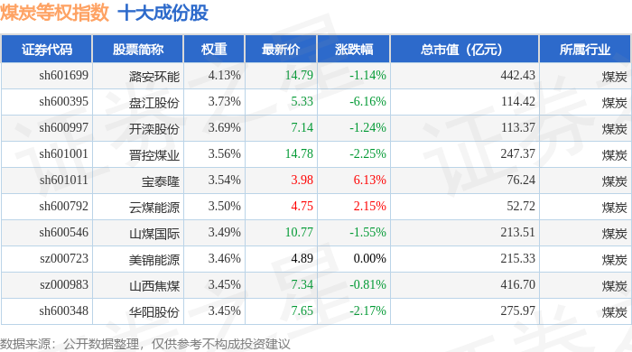 资金流向方面,煤炭等权(399990)指数成份股当日主力资金净流出合计5.5亿元,游资资金净流入合计1.28亿元,散户资金净流入合计4.21亿元。成份股资金流向详情见下表: