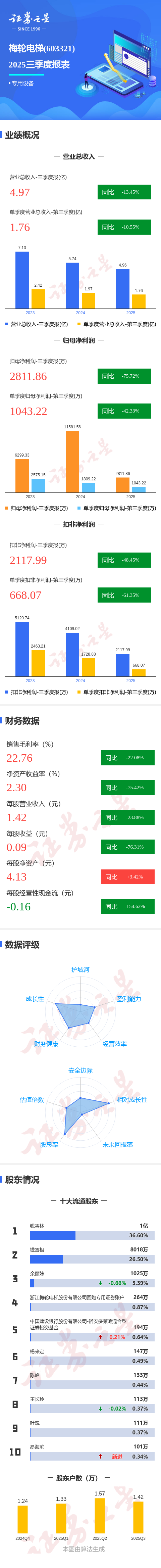证券之星消息,梅轮电梯2025年三季报显示,公司主营收入4.97亿元,同比下降13.46%;归母净利润2811.86万元,同比下降75.72%;扣非净利润2117.99万元,同比下降48.46%;其中2025年第三季度,公司单季度主营收入1.76亿元,同比下降10.55%;单季度归母净利润1043.22万元,同比下降42.34%;单季度扣非净利润668.07万元,同比下降61.36%;负债率29.31%,投资收益60.51万元,财务费用-1050.15万元,毛利率22.76%。