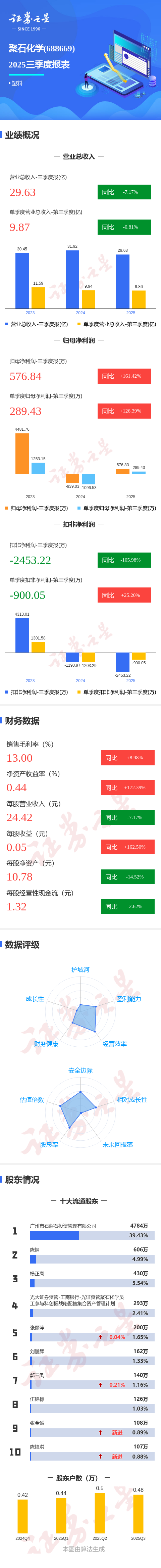 证券之星消息,聚石化学2025年三季报显示,公司主营收入29.63亿元,同比下降7.17%;归母净利润576.84万元,同比上升161.43%;扣非净利润-2453.22万元,同比下降105.98%;其中2025年第三季度,公司单季度主营收入9.87亿元,同比下降0.81%;单季度归母净利润289.43万元,同比上升126.4%;单季度扣非净利润-900.05万元,同比上升25.2%;负债率72.1%,投资收益1700.75万元,财务费用8475.09万元,毛利率13.0%。