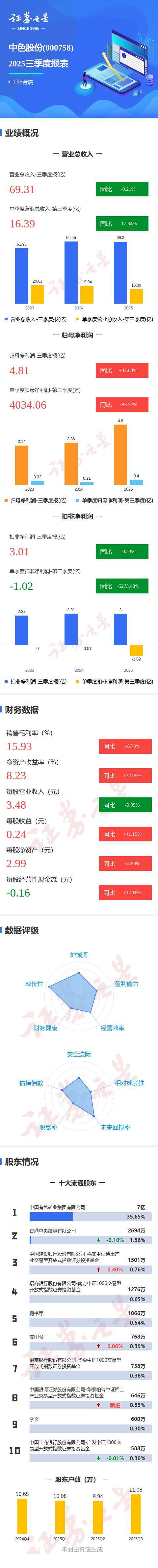证券之星消息,中色股份2025年三季报显示,公司主营收入69.31亿元,同比下降0.21%;归母净利润4.81亿元,同比上升42.84%;扣非净利润3.01亿元,同比下降0.24%;其中2025年第三季度,公司单季度主营收入16.39亿元,同比下降17.84%;单季度归母净利润4034.06万元,同比上升83.37%;单季度扣非净利润-1.02亿元,同比下降5275.48%;负债率59.28%,投资收益1.49亿元,财务费用3796.49万元,毛利率15.93%。