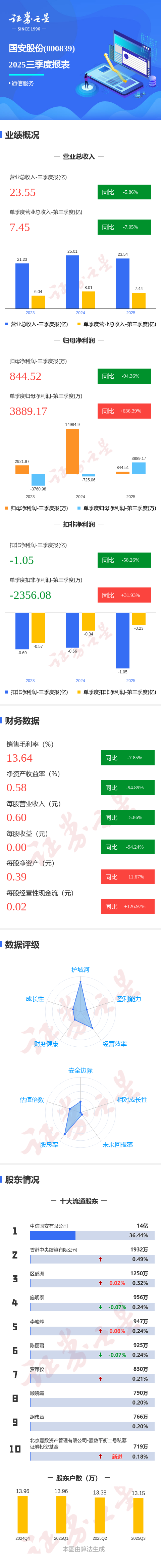 证券之星消息,国安股份2025年三季报显示,公司主营收入23.55亿元,同比下降5.86%;归母净利润844.52万元,同比下降94.36%;扣非净利润-1.05亿元,同比下降58.27%;其中2025年第三季度,公司单季度主营收入7.45亿元,同比下降7.06%;单季度归母净利润3889.17万元,同比上升636.39%;单季度扣非净利润-2356.08万元,同比上升31.93%;负债率85.17%,投资收益-4579.13万元,财务费用7393.4万元,毛利率13.64%。