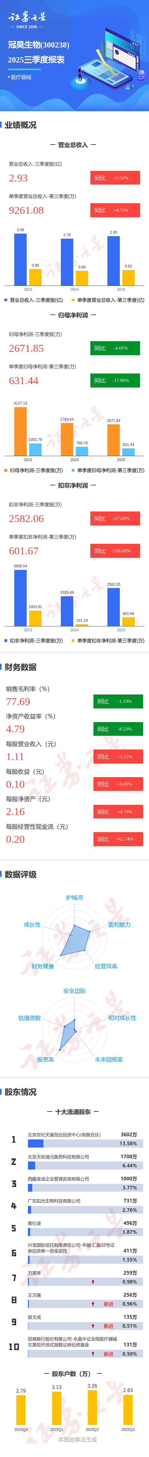 证券之星消息,冠昊生物2025年三季报显示,公司主营收入2.93亿元,同比上升5.52%;归母净利润2671.85万元,同比下降4.02%;扣非净利润2582.06万元,同比上升27.6%;其中2025年第三季度,公司单季度主营收入9261.08万元,同比上升4.72%;单季度归母净利润631.44万元,同比下降17.87%;单季度扣非净利润601.67万元,同比上升358.61%;负债率36.28%,投资收益19.19万元,财务费用271.48万元,毛利率77.69%。