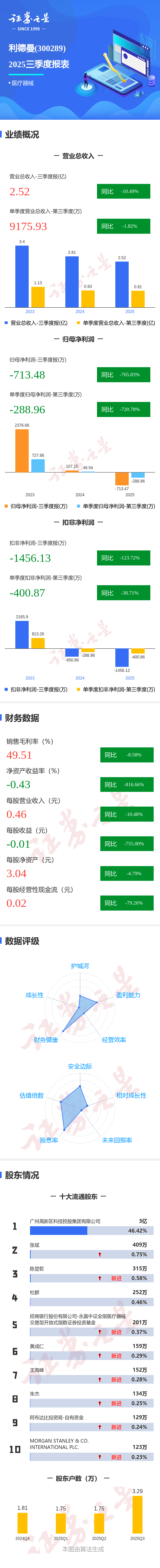 证券之星消息,利德曼2025年三季报显示,公司主营收入2.52亿元,同比下降10.49%;归母净利润-713.48万元,同比下降765.83%;扣非净利润-1456.13万元,同比下降123.72%;其中2025年第三季度,公司单季度主营收入9175.93万元,同比下降1.83%;单季度归母净利润-288.96万元,同比下降720.79%;单季度扣非净利润-400.87万元,同比下降38.72%;负债率5.33%,投资收益388.62万元,财务费用-388.38万元,毛利率49.51%。