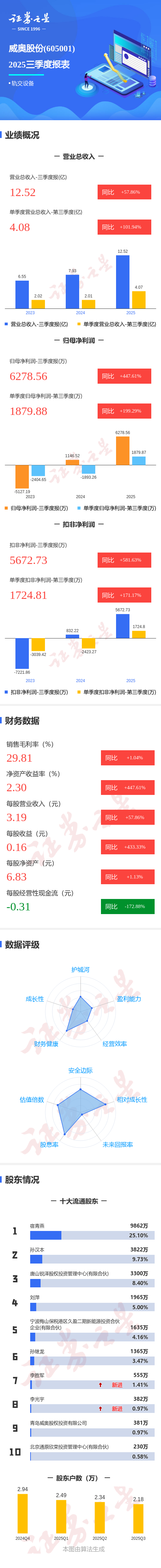 证券之星消息,威奥股份2025年三季报显示,公司主营收入12.52亿元,同比上升57.87%;归母净利润6278.56万元,同比上升447.61%;扣非净利润5672.73万元,同比上升581.63%;其中2025年第三季度,公司单季度主营收入4.08亿元,同比上升101.95%;单季度归母净利润1879.88万元,同比上升199.29%;单季度扣非净利润1724.81万元,同比上升171.18%;负债率47.83%,投资收益1877.18万元,财务费用1904.24万元,毛利率29.81%。