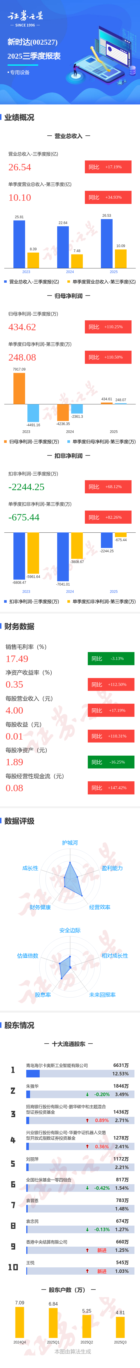 证券之星消息,新时达2025年三季报显示,公司主营收入26.54亿元,同比上升17.2%;归母净利润434.62万元,同比上升110.26%;扣非净利润-2244.25万元,同比上升68.13%;其中2025年第三季度,公司单季度主营收入10.1亿元,同比上升34.94%;单季度归母净利润248.08万元,同比上升110.51%;单季度扣非净利润-675.44万元,同比上升82.27%;负债率68.33%,投资收益332.56万元,财务费用1888.49万元,毛利率17.49%。