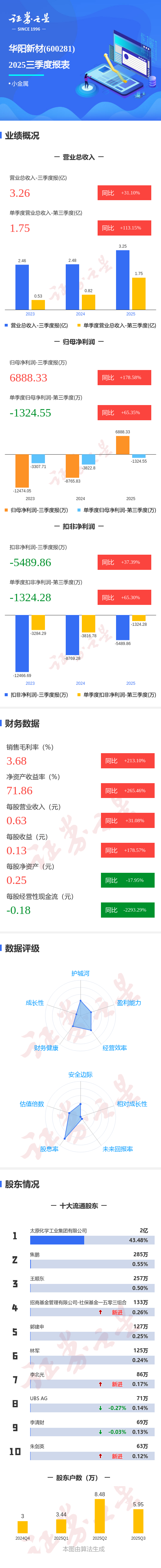 证券之星消息,华阳新材2025年三季报显示,公司主营收入3.26亿元,同比上升31.1%;归母净利润6888.33万元,同比上升178.58%;扣非净利润-5489.86万元,同比上升37.4%;其中2025年第三季度,公司单季度主营收入1.75亿元,同比上升113.15%;单季度归母净利润-1324.55万元,同比上升65.35%;单季度扣非净利润-1324.28万元,同比上升65.3%;负债率86.5%,投资收益11.53万元,财务费用1767.67万元,毛利率3.68%。