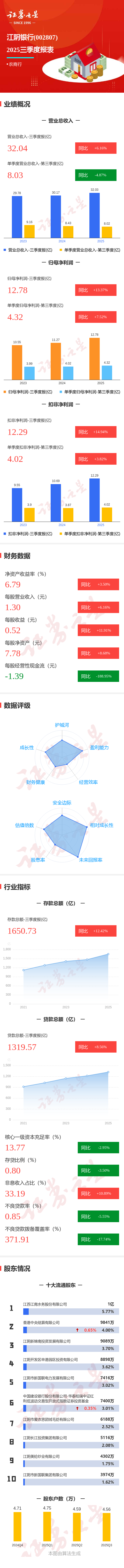 证券之星消息,江阴银行2025年三季报显示,公司主营收入32.04亿元,同比上升6.17%;归母净利润12.78亿元,同比上升13.38%;扣非净利润12.29亿元,同比上升14.94%;其中2025年第三季度,公司单季度主营收入8.03亿元,同比下降4.88%;单季度归母净利润4.32亿元,同比上升7.52%;单季度扣非净利润4.02亿元,同比上升3.82%;负债率90.68%,投资收益9.32亿元。