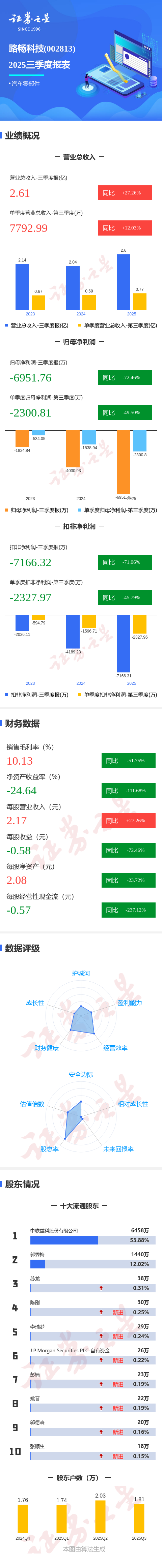 证券之星消息,路畅科技2025年三季报显示,公司主营收入2.61亿元,同比上升27.26%;归母净利润-6951.76万元,同比下降72.46%;扣非净利润-7166.32万元,同比下降71.07%;其中2025年第三季度,公司单季度主营收入7792.99万元,同比上升12.04%;单季度归母净利润-2300.81万元,同比下降49.51%;单季度扣非净利润-2327.97万元,同比下降45.8%;负债率50.84%,投资收益-144.14万元,财务费用-31.72万元,毛利率10.13%。