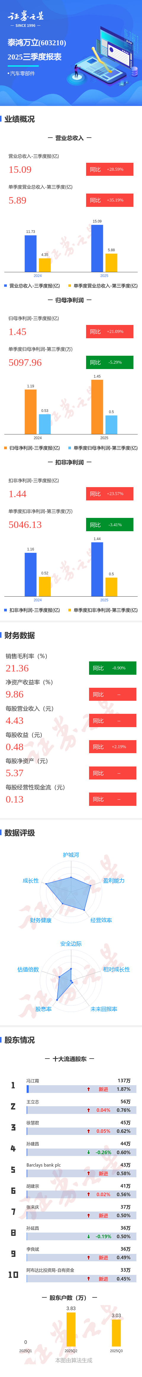 证券之星消息,泰鸿万立2025年三季报显示,公司主营收入15.09亿元,同比上升28.6%;归母净利润1.45亿元,同比上升21.1%;扣非净利润1.44亿元,同比上升23.57%;其中2025年第三季度,公司单季度主营收入5.89亿元,同比上升35.2%;单季度归母净利润5097.96万元,同比下降5.3%;单季度扣非净利润5046.13万元,同比下降3.42%;负债率39.1%,投资收益-460.77万元,财务费用722.44万元,毛利率21.36%。