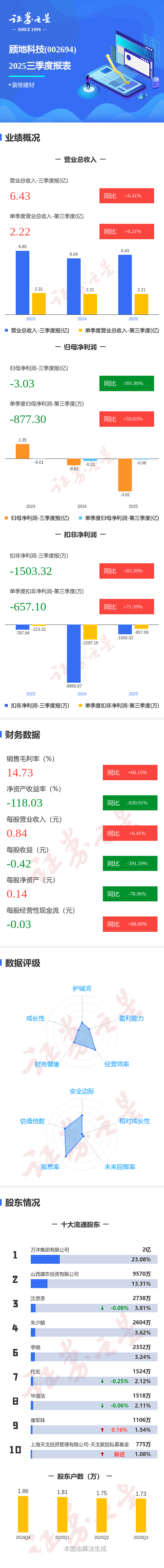 证券之星消息,顾地科技2025年三季报显示,公司主营收入6.43亿元,同比上升6.42%;归母净利润-3.03亿元,同比下降391.81%;扣非净利润-1503.32万元,同比上升83.2%;其中2025年第三季度,公司单季度主营收入2.22亿元,同比上升0.21%;单季度归母净利润-877.3万元,同比上升59.03%;单季度扣非净利润-657.1万元,同比上升71.4%;负债率91.05%,财务费用105.35万元,毛利率14.73%。