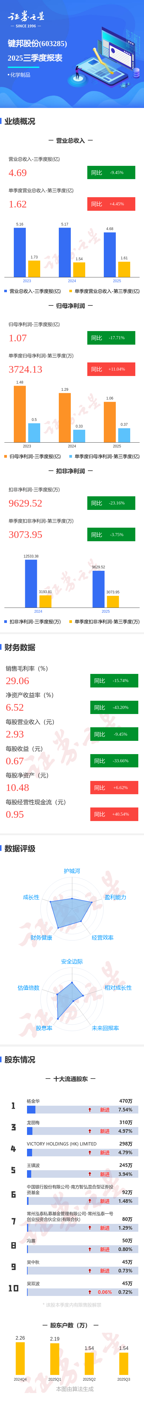证券之星消息,键邦股份2025年三季报显示,公司主营收入4.69亿元,同比下降9.45%;归母净利润1.07亿元,同比下降17.71%;扣非净利润9629.52万元,同比下降23.17%;其中2025年第三季度,公司单季度主营收入1.62亿元,同比上升4.45%;单季度归母净利润3724.13万元,同比上升11.04%;单季度扣非净利润3073.95万元,同比下降3.75%;负债率7.81%,投资收益735.38万元,财务费用-483.54万元,毛利率29.06%。