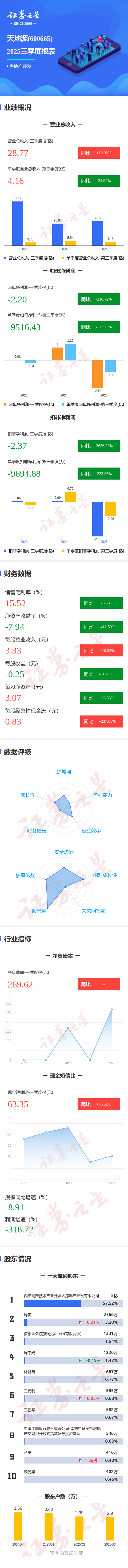 证券之星消息,天地源2025年三季报显示,公司主营收入28.77亿元,同比上升10.92%;归母净利润-2.2亿元,同比下降318.72%;扣非净利润-2.37亿元,同比下降2626.23%;其中2025年第三季度,公司单季度主营收入4.16亿元,同比下降25.0%;单季度归母净利润-9516.43万元,同比下降173.75%;单季度扣非净利润-9694.88万元,同比下降233.96%;负债率85.82%,投资收益-628.66万元,财务费用2.6亿元,毛利率15.52%。