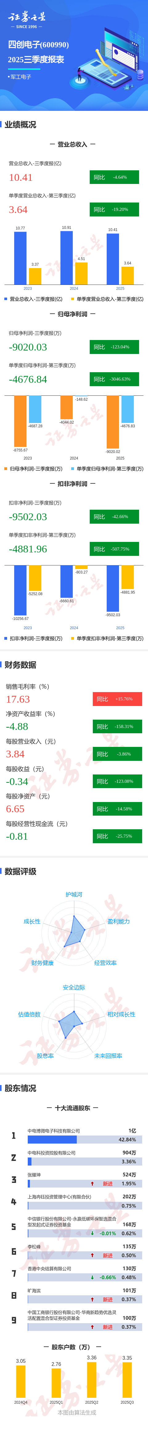 证券之星消息,四创电子2025年三季报显示,公司主营收入10.41亿元,同比下降4.64%;归母净利润-9020.03万元,同比下降123.05%;扣非净利润-9502.03万元,同比下降42.66%;其中2025年第三季度,公司单季度主营收入3.64亿元,同比下降19.2%;单季度归母净利润-4676.84万元,同比下降3046.64%;单季度扣非净利润-4881.96万元,同比下降507.76%;负债率69.11%,投资收益77.96万元,财务费用3497.51万元,毛利率17.63%。