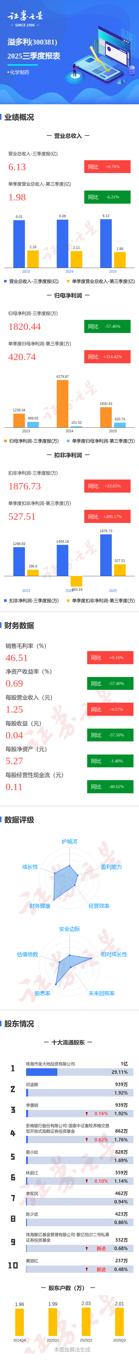 证券之星消息,溢多利2025年三季报显示,公司主营收入6.13亿元,同比上升0.77%;归母净利润1820.44万元,同比下降57.47%;扣非净利润1876.73万元,同比上升33.65%;其中2025年第三季度,公司单季度主营收入1.98亿元,同比下降6.21%;单季度归母净利润420.74万元,同比上升314.42%;单季度扣非净利润527.51万元,同比上升209.17%;负债率8.95%,投资收益157.27万元,财务费用-481.62万元,毛利率46.51%。