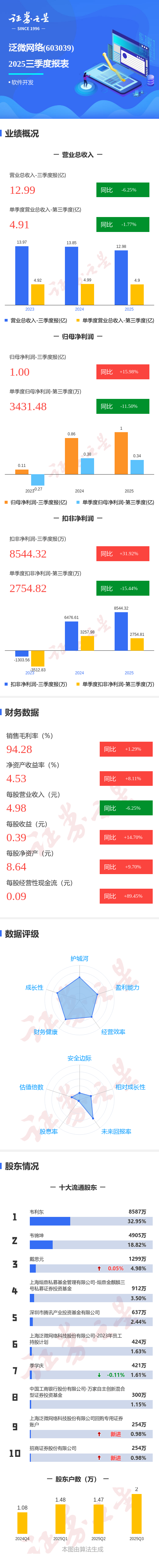 证券之星消息,泛微网络2025年三季报显示,公司主营收入12.99亿元,同比下降6.26%;归母净利润1.0亿元,同比上升15.99%;扣非净利润8544.32万元,同比上升31.93%;其中2025年第三季度,公司单季度主营收入4.91亿元,同比下降1.78%;单季度归母净利润3431.48万元,同比下降11.51%;单季度扣非净利润2754.82万元,同比下降15.44%;负债率42.98%,投资收益-1534.02万元,财务费用-2476.61万元,毛利率94.28%。