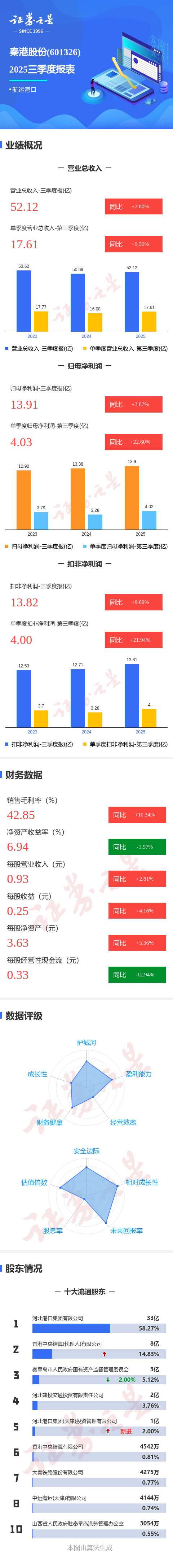证券之星消息,秦港股份2025年三季报显示,公司主营收入52.12亿元,同比上升2.81%;归母净利润13.91亿元,同比上升3.87%;扣非净利润13.82亿元,同比上升8.69%;其中2025年第三季度,公司单季度主营收入17.61亿元,同比上升9.51%;单季度归母净利润4.03亿元,同比上升22.61%;单季度扣非净利润4.0亿元,同比上升21.94%;负债率24.27%,投资收益2.99亿元,财务费用1253.8万元,毛利率42.85%。
