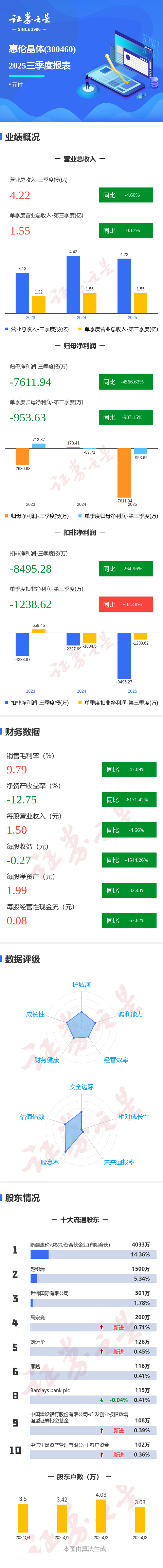 证券之星消息,惠伦晶体2025年三季报显示,公司主营收入4.22亿元,同比下降4.67%;归母净利润-7611.94万元,同比下降4566.64%;扣非净利润-8495.28万元,同比下降264.96%;其中2025年第三季度,公司单季度主营收入1.55亿元,同比下降0.17%;单季度归母净利润-953.63万元,同比下降987.15%;单季度扣非净利润-1238.62万元,同比上升32.48%;负债率63.71%,投资收益-5.06万元,财务费用2166.01万元,毛利率9.79%。