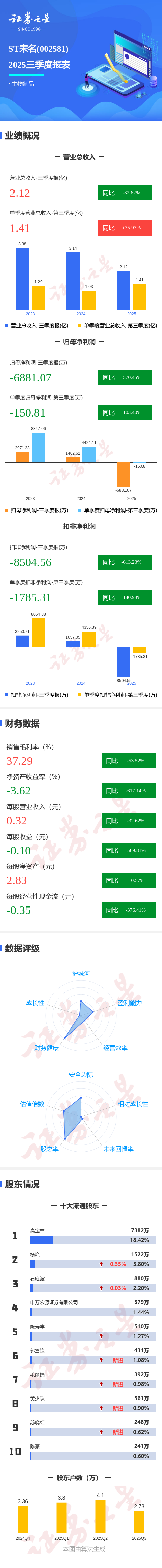 证券之星消息,ST未名2025年三季报显示,公司主营收入2.12亿元,同比下降32.62%;归母净利润-6881.07万元,同比下降570.46%;扣非净利润-8504.56万元,同比下降613.23%;其中2025年第三季度,公司单季度主营收入1.41亿元,同比上升35.94%;单季度归母净利润-150.81万元,同比下降103.41%;单季度扣非净利润-1785.31万元,同比下降140.98%;负债率10.0%,投资收益1480.62万元,财务费用-310.48万元,毛利率37.29%。