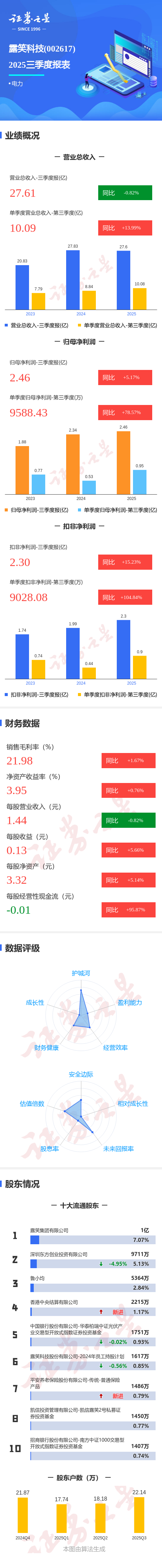 证券之星消息,露笑科技2025年三季报显示,公司主营收入27.61亿元,同比下降0.82%;归母净利润2.46亿元,同比上升5.17%;扣非净利润2.3亿元,同比上升15.24%;其中2025年第三季度,公司单季度主营收入10.09亿元,同比上升13.99%;单季度归母净利润9588.43万元,同比上升78.57%;单季度扣非净利润9028.08万元,同比上升104.85%;负债率39.49%,投资收益379.16万元,财务费用6690.25万元,毛利率21.98%。