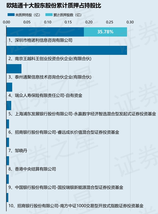截止本公告日,股东深圳市格诺利信息咨询有限公司已累计质押股份1046.0万股,占其持股总数的35.78%。本次质押后欧陆通十大股东的累计质押股份占持股比例(占持股比例的计算以公司最新一期财务报表公布的十大股东的持股总数为基准)见下图: