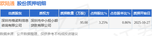 证券之星消息,欧陆通(300870)10月28日公开信息显示,股东深圳市格诺利信息咨询有限公司向深圳市中小担小额贷款有限公司合计质押95.0万股,占总股本0.86%。质押详情见下表: