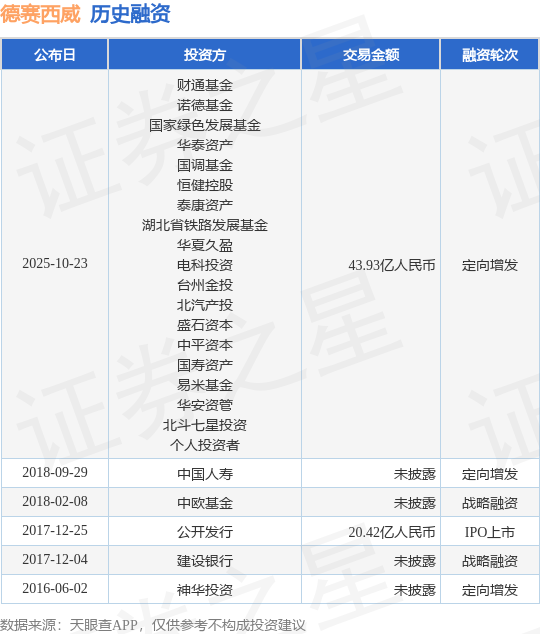 证券之星消息,根据天眼查APP于10月23日公布的信息整理,惠州市德赛西威汽车电子股份有限公司定向增发融资,融资额43.93亿人民币,参与投资的机构包括财通基金,诺德基金,国家绿色发展基金,华泰资产,国调基金,恒健控股,泰康资产,湖北省铁路发展基金,华夏久盈,电科投资,台州金投,北汽产投,盛石资本,中平资本,国寿资产,易米基金,华安资管,北斗七星投资,个人投资者。