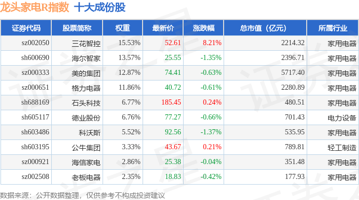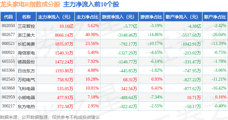 资金流向方面,龙头家电R(480028)指数成份股当日主力资金净流入合计4.22亿元,游资资金净流出合计2.64亿元,散户资金净流出合计1.57亿元。成份股资金流向详情见下表: