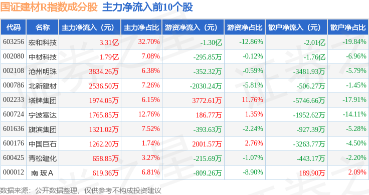 资金流向方面,国证建材R(480048)指数成份股当日主力资金净流入合计3.73亿元,游资资金净流出合计5403.23万元,散户资金净流出合计3.19亿元。成份股资金流向详情见下表: