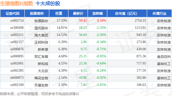资金流向方面,生猪指数R(480073)指数成份股当日主力资金净流出合计1.38亿元,游资资金净流入合计1.52亿元,散户资金净流出合计1416.87万元。成份股资金流向详情见下表: