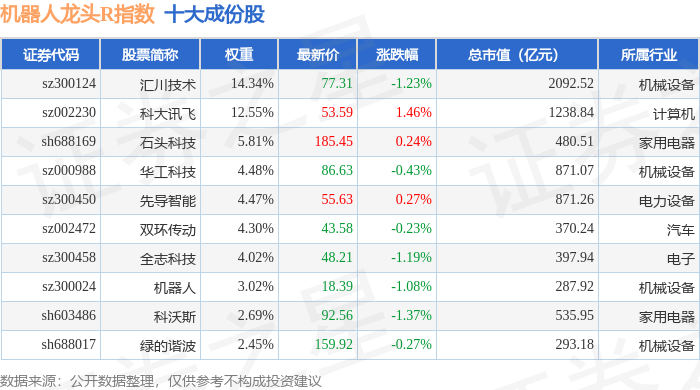 资金流向方面,机器人龙头R(480071)指数成份股当日主力资金净流出合计11.89亿元,游资资金净流入合计4.35亿元,散户资金净流入合计7.54亿元。成份股资金流向详情见下表: