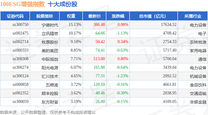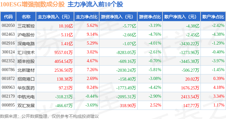 资金流向方面,100ESG增强(970033)指数成份股当日主力资金净流出合计29.66亿元,游资资金净流入合计16.31亿元,散户资金净流入合计13.35亿元。成份股资金流向详情见下表: