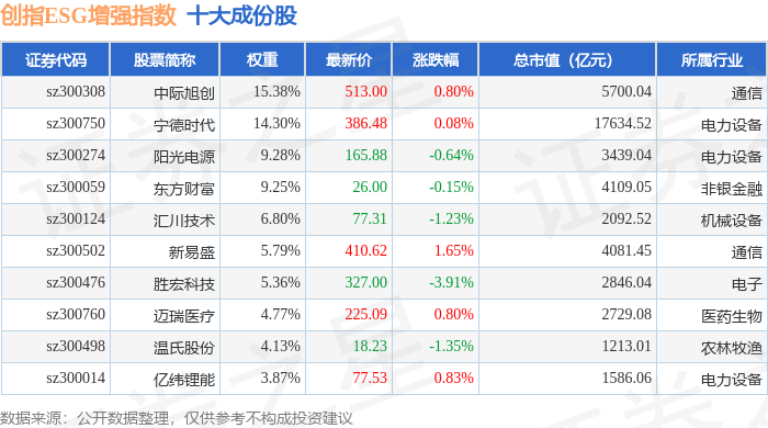 创指ESG增强(970034)指数十大成份股详情如下:
