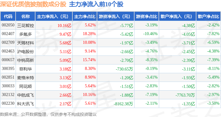 资金流向方面,深证优质信披(970065)指数成份股当日主力资金净流出合计137.03亿元,游资资金净流入合计26.05亿元,散户资金净流入合计110.98亿元。成份股资金流向详情见下表: