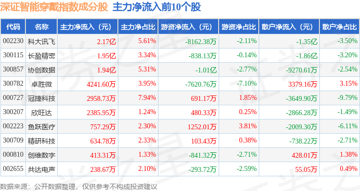 资金流向方面,深证智能穿戴(970074)指数成份股当日主力资金净流出合计34.39亿元,游资资金净流入合计6.46亿元,散户资金净流入合计27.93亿元。成份股资金流向详情见下表: