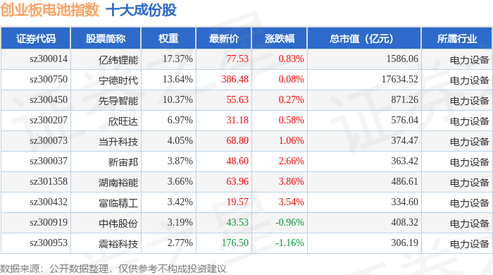 证券之星消息,10月28日,创业板电池(970081)指数报收于3479.5点,涨1.05%,成交531.94亿元,换手率5.64%。当日该指数成份股中,上涨的有30家,锦富技术以20.06%的涨幅领涨,下跌的有10家,紫建电子以3.86%的跌幅领跌。
