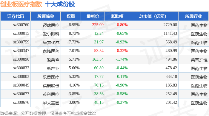 创业板医疗(970082)指数十大成份股详情如下: