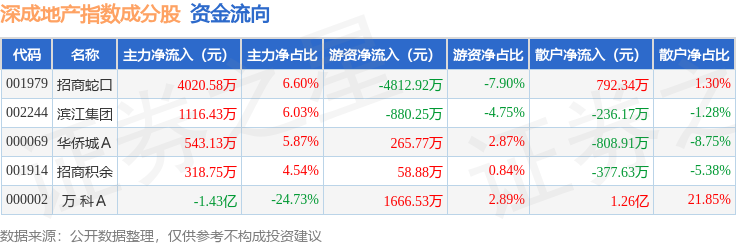资金流向方面,深成地产(971001)指数成份股当日主力资金净流出合计8283.82万元,游资资金净流出合计3701.98万元,散户资金净流入合计1.2亿元。成份股资金流向详情见下表: