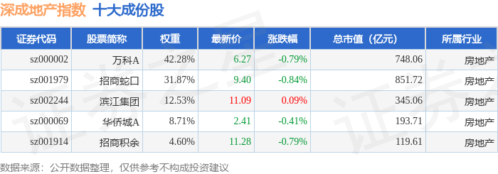 证券之星消息,10月28日,深成地产(971001)指数报收于483.13点,跌0.67%,成交15.35亿元,换手率0.76%。当日该指数成份股中,上涨的有1家,滨江集团以0.09%的涨幅领涨,下跌的有4家,招商蛇口以0.84%的跌幅领跌。