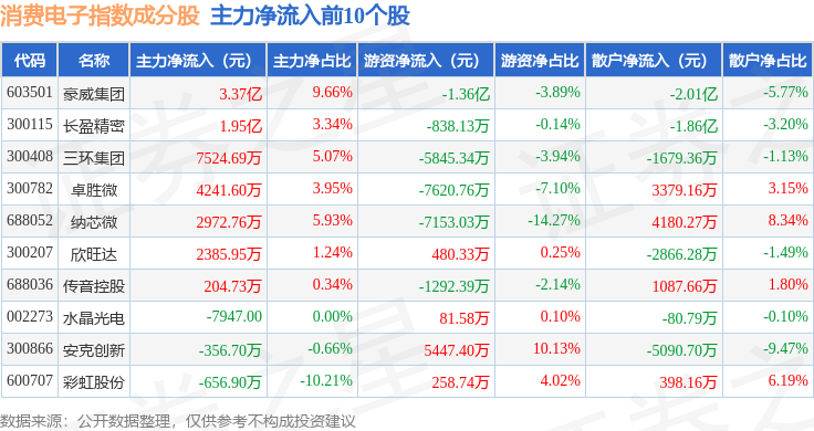 资金流向方面,消费电子(980030)指数成份股当日主力资金净流出合计67.18亿元,游资资金净流入合计19.26亿元,散户资金净流入合计47.93亿元。成份股资金流向详情见下表: