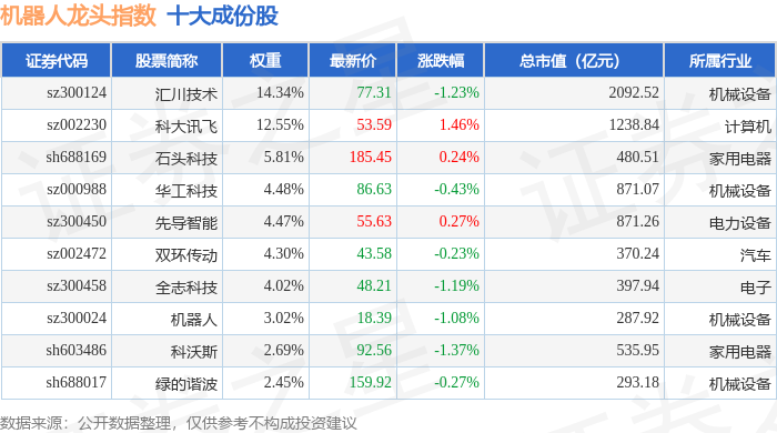 机器人龙头(980071)指数十大成份股详情如下: