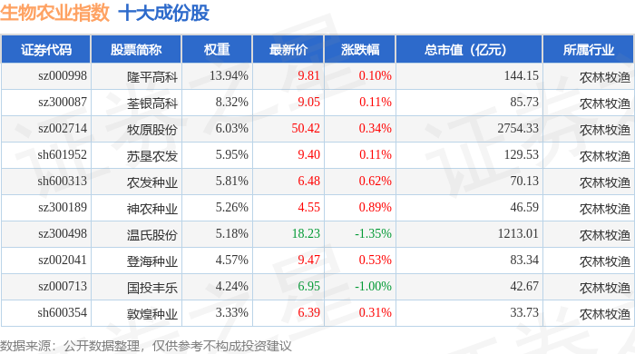 证券之星消息,10月28日,生物农业(980072)指数报收于3261.83点,跌0.2%,成交173.02亿元,换手率1.5%。当日该指数成份股中,上涨的有29家,中牧股份以4.71%的涨幅领涨,下跌的有47家,亨通股份以6.37%的跌幅领跌。