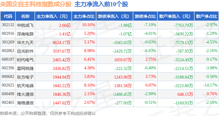 资金流向方面,央国企自主科技(980083)指数成份股当日主力资金净流出合计41.12亿元,游资资金净流入合计19.16亿元,散户资金净流入合计21.96亿元。成份股资金流向详情见下表: