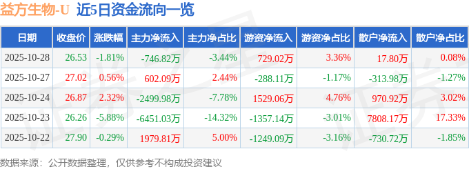 证券之星消息,截至2025年10月28日收盘,益方生物(688382)报收于26.53元,下跌1.81%,换手率1.93%,成交量8.07万手,成交额2.17亿元。