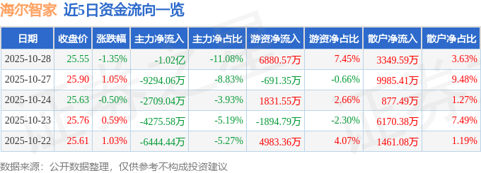 证券之星消息,截至2025年10月28日收盘,海尔智家(600690)报收于25.55元,下跌1.35%,换手率0.58%,成交量36.02万手,成交额9.23亿元。