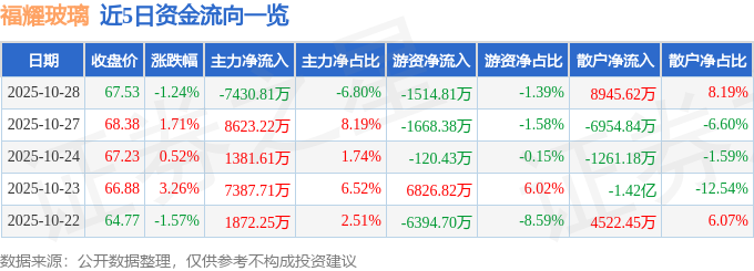 证券之星消息,截至2025年10月28日收盘,福耀玻璃(600660)报收于67.53元,下跌1.24%,换手率0.81%,成交量16.21万手,成交额10.93亿元。
