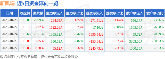 证券之星消息,截至2025年10月28日收盘,新凤鸣(603225)报收于16.01元,下跌0.99%,换手率0.68%,成交量10.24万手,成交额1.65亿元。